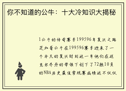 1、公牛的传奇赛季:1995-96年复兴之路 芝加哥公牛在1995-96赛季迎来了一个非凡的复兴时刻。这一年,他们在迈克尔·乔丹的带领下,创下了72胜10负的NBA历史最佳常规赛成绩。这不仅仅是一个战绩的标志,更意味着公牛在乔丹离开两年后找回了自己的巅峰状态。这个赛季的成功为球队带来了一个无与伦比的冠军荣耀,也是公牛队历史中最为辉煌的篇章之一。 在1995年乔丹复出后,公牛队通过引入“坏孩子...